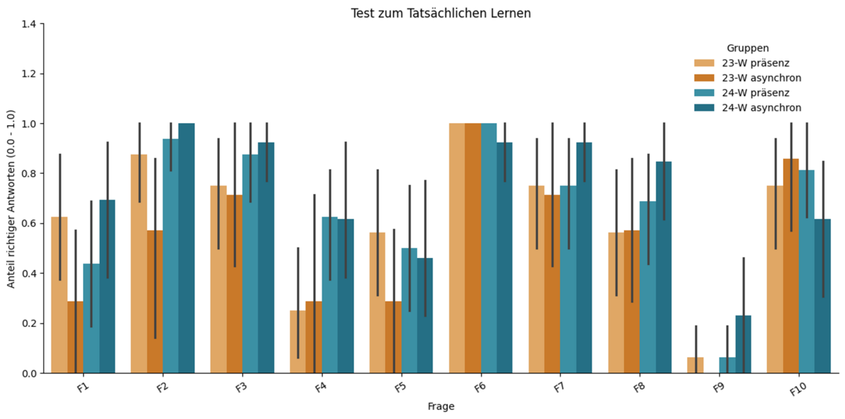 Die obige Abbildung zeigt den Anteil richtiger Antworten an den einzelnen Fragen zu den Lernzielen zwischen 0 und 1. Ein Mann-Whitney-U Test legt nahe, dass in beiden Semestern keine signifikanten Unterschiede zwischen den einzelnen Teilnahmemodaliäten vorliegt (WS-23: präsenz: N=16, asynchron: N=7, 0,12 < p < 1,0; WS-24: präsenz: N=16, asynchron: N=13, 0,18 < p < 0,98).