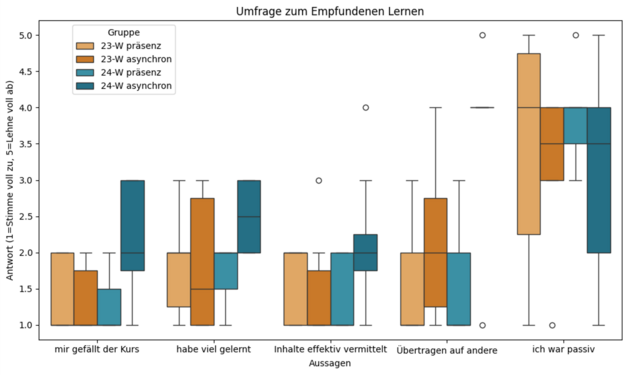 Insgesamt ist die Anzahl der Teilnehmenden zu gering um gesicherte Aussagen treffen zu können. Außerdem wurde nur eine Unterrichtseinheit untersucht. Hinsichtlich des empfundenen Lernerfolgs gibt es Unterschiede zwischen WS-23 und WS-24 – bei letzterem wird die asynchrone Modalität negativer bewertet. Die tatsächlichen Lernerfolge zeigen allerdings keine signifikanten Unterschiede zwischen den Teilnahmeformen bei beiden Semestern. Im Rahmen der untersuchten Unterrichtseinheit kann angenommen werden, dass die asynchrone Teilnahme äquivalent zur Teilnahme in Präsenz ist. Allgemein lässt sich über das gesamte Semester hin aber beobachten, dass das asynchrone Angebot in diesem Modul nur selten und nur von wenigen Studierenden genutzt wird.