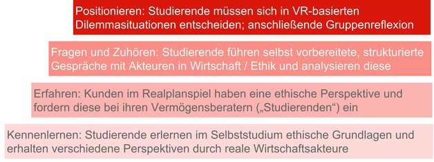 - Erfahren: Die im Realplanspiel auftretenden Persona wurden um eine ethische Komponente erweitert. Mit dieser werden die Studierenden in ihrer Rolle als Vermögensberater*innen im Verlauf des Planspiels konfrontiert.