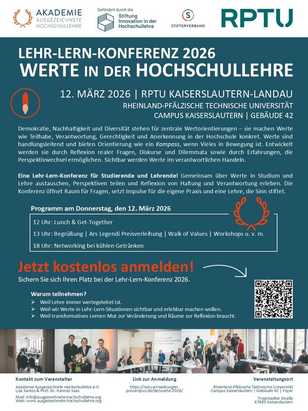 Die Akademie Ausgezeichnete Hochschullehre e.V. macht dies am 12. März 2026 von 12 - 19 Uhr zum Thema. Sie bringt Lehrende, Hochschuldidaktiker:innen, Studierende und Verantwortliche zusammen um Perspektiven zu bündeln, Erfahrungen zu teilen und neue Ideen anzustoßen.